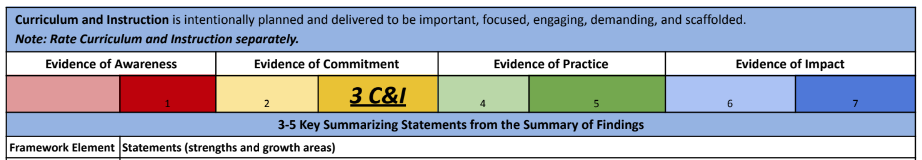 | The administration and key stakeholders have a great vision and plan to get all staff members heading in the correct direction with positive outcomes. Documents, procedures, and deliverables are currently being processed, with expectations defined for the future. | Build on the Vision of Instruction to ensure it moves to the classroom level. |